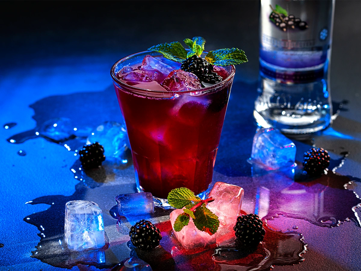 Preparation: Pour Nicolaus Blackcurrant Vodka into a long drink glass, add cane sugar to taste, sliced limes, and a little lime juice. Add ice and top up with soda and mix. Garnish with blackberries, blueberries, mint and lime.