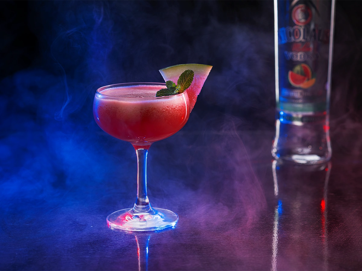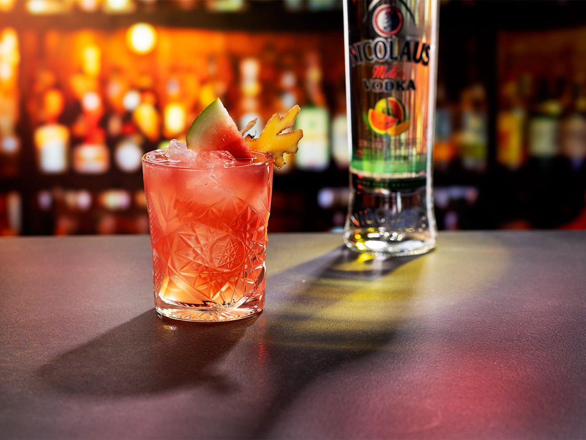 Preparation: Add pieces of red watermelon, lemon juice and crushed melon into a whisky glass. Add Nicolaus Melon Vodka, ice and top up with ginger ale. Garnish with a slice of ginger.