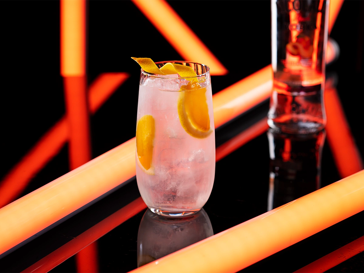 Preparation: Pour Nicolaus Peach Vodka into a long drink glass, add lemon juice, ice and top up with soda. Garnish with lemon and peach.