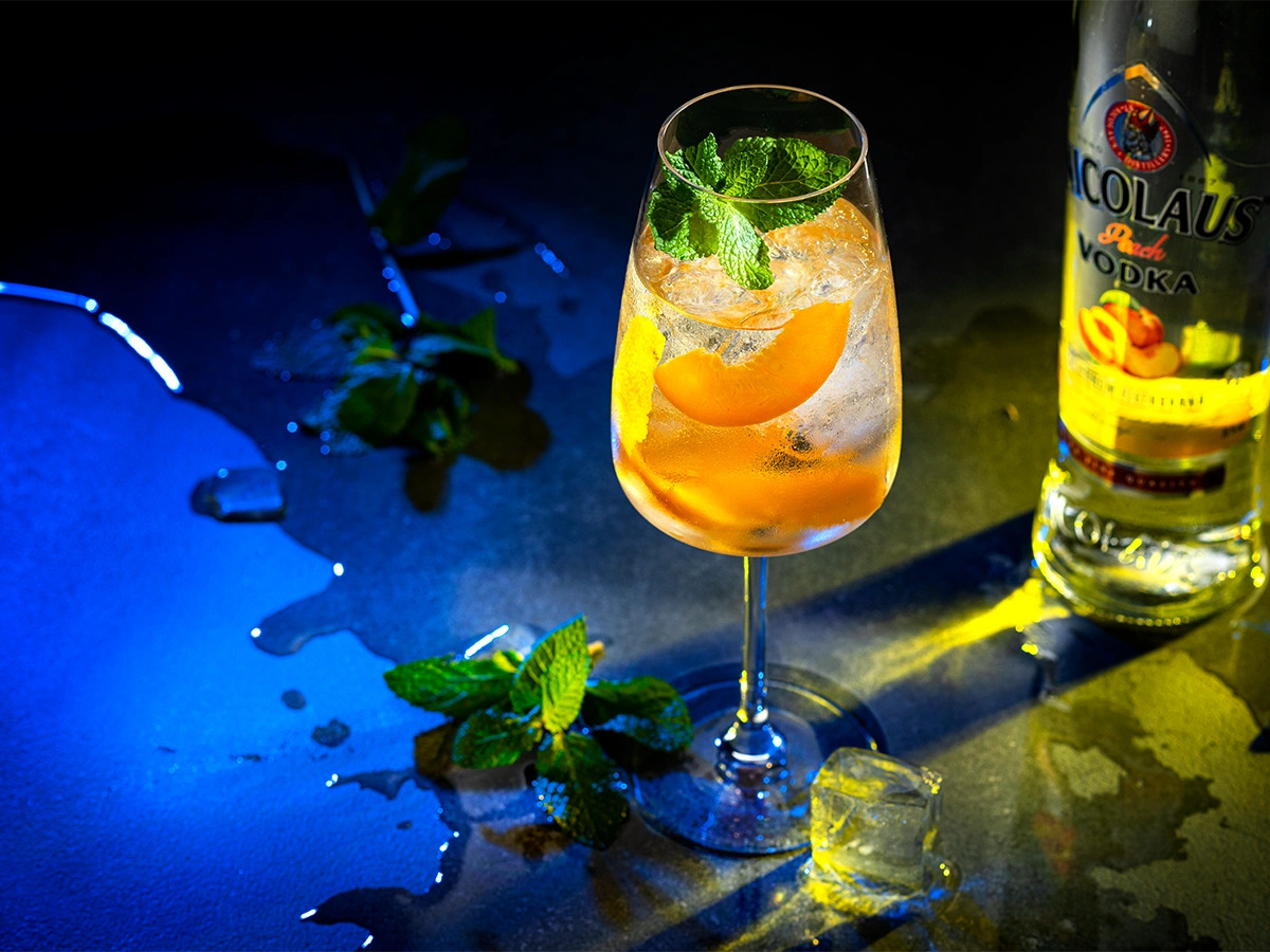 Preparation: Pour Nicolaus Peach Vodka into a wine glass, add base syrup, ice, and sparkling wine/prosecco and soda to taste. Garnish with peach and mint.